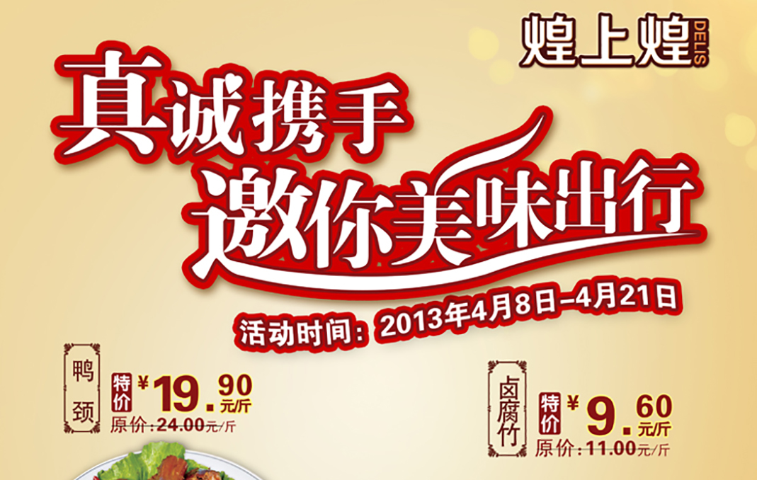 活動時間:2013年4月8日-4月21日活動內容:鴨脖特價19.9元/斤(原價24元/斤),鹵腐竹特價9.6元/...